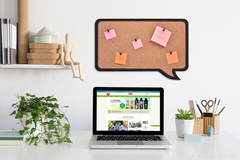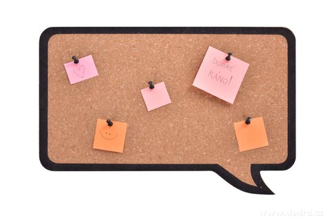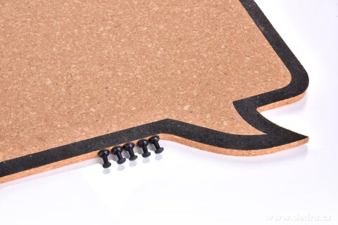 Korková nástěnka ve tvaru komiksové „bubliny“ s pěti špendlíky na připevnění, v zadní části dva otvory pro možné zavěšení na zeď.