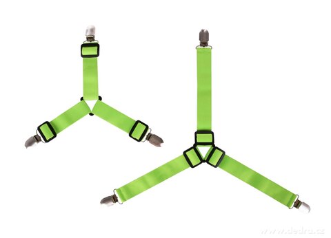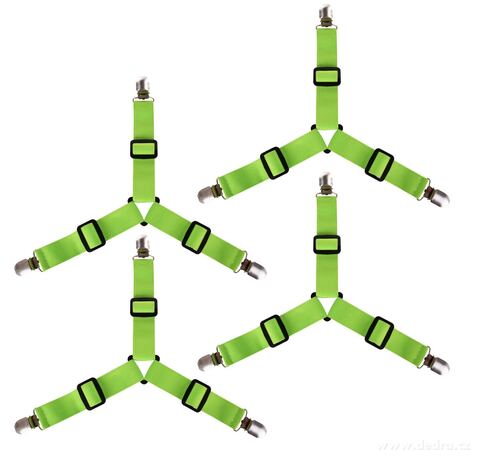 4 ks napínáky na prostěradla s upínacími klipy, rohové, velmi pružné, nastavitelná délka. Materiál guma, kov a plast. Délka jednoho popruhu cca 13 cm – 30,5 cm.