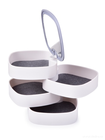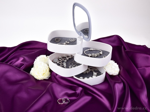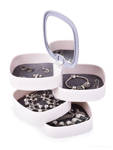 Elegantní šperkovnice BEAUTY se 4 otočnými patry, zrcátkem a jemným polstrováním. Ideální pro šperky, doplňky i kosmetiku. Kompaktní design, protiskluzová úprava, stylový doplněk na toaletní stolek.