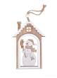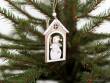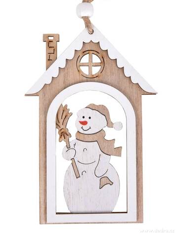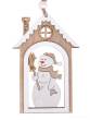 Dřevěná dekorace SNĚHULÁK NA PRAHU ve tvaru domečku s veselým sněhulákem. Rozměry 7,8 × 12 cm. Přírodní vánoční ozdoba na stromek, věnec, dveře i okno.