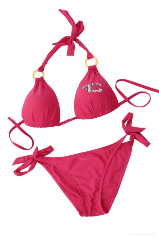 Trojúhelníkové bikiny s výztuží. Podprsenka se zavazováním vzadu a za krkem umožňuje nastavení Vaší velikosti. Podprsenka je s výztuží a celopodšitá, zdobená kovovými kruhy. Kalhotky se zavazováním na bocích umožňují nastavení Vaší velikosti, přední část je celopodšitá. Univerzální velikost (odpovídá XS, S, M, L).