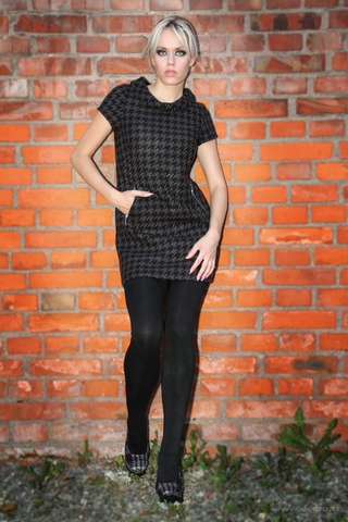 DIXIE black&grey Pouzdrové šaty z měkčeného tkaného akrylicu s hladkou podšívkou. Voálový límec. V přední části dvě decentní všité kapsy na zip. Zeštíhlující sámky na zadním dílu. Elegantní, jednoduché, ženské. Nestárnoucí černošedý vzor kohoutí stopa. Délka ve velikosti M: cca 83 cm.