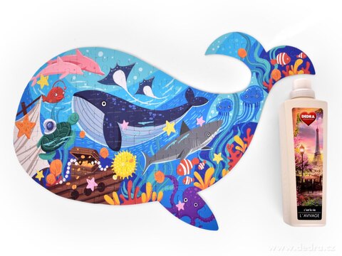108 ks PUZZLE OCEÁN ve tvaru velryby, v praktickém kufříku s popruhem na přenášení, vyrobeno z pevného kartónu.