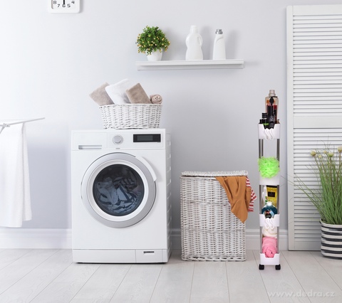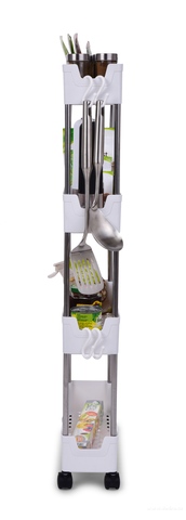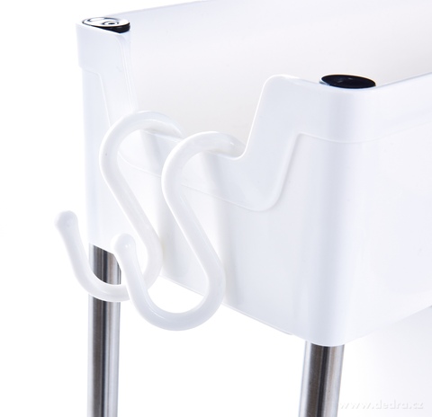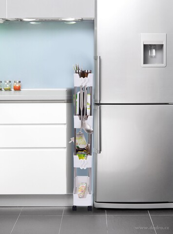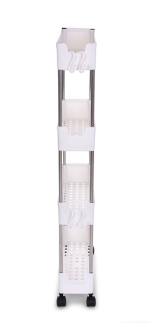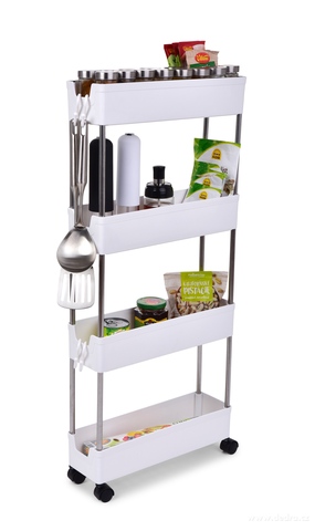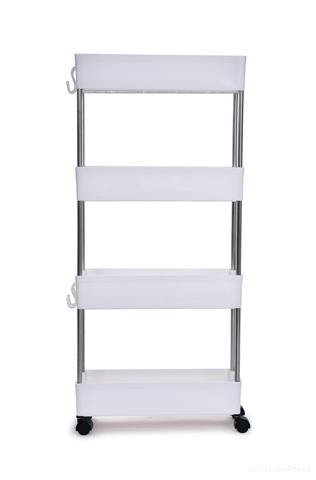 Pojízdný regál do úzkých prostor se 4 odnímatelnými háčky na pověšení a 4 pojezdovými kolečky pro snadnou manipulaci. Kombinace kovu a plastu. Hloubka 39 cm, 4 patrový.