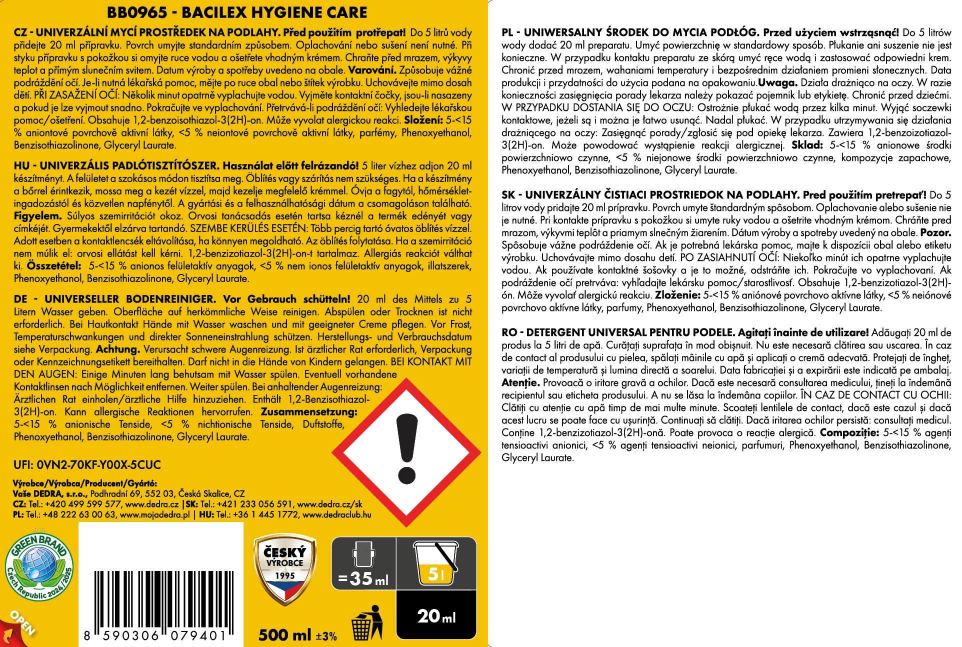 BACILEX HYGIENIC FLOOR CARE je univerzální koncentrát na mytí podlah 500 ml se svěží vůní manga. Účinně odstraňuje nečistoty i mastnotu, nezanechává šmouhy, obsahuje biologicky odbouratelné složky a je bez PFAS. Vhodný na dlažbu, laminát, PVC i další omyvatelné povrchy.
