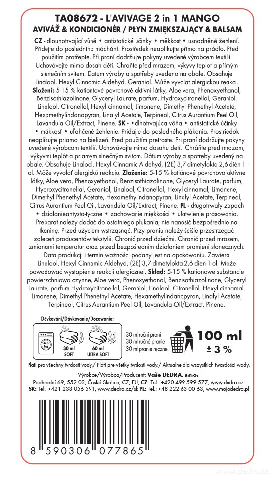 Výrobce / dovozce: Vaše Dedra s. r. o., Podhradní 69, Česká Skalice, Česká republika