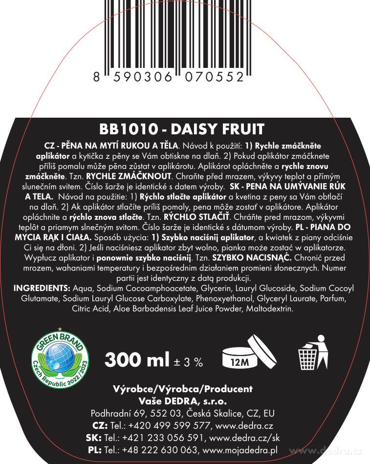 DAISY FLOWER pěnové mýdlo na ruce a tělo promění každé mytí v hravou chvíli díky unikátnímu dávkovači, který vytváří pěnu ve tvaru kytičky. Stačí jeden rychlý stisk pro dokonalý tvar – a pokud chceš více pěny, zmáčkni dvakrát. Vydrží až 3× déle než běžná mýdla, obsahuje Aloe Vera a jeho jemné složení pokožku zvláčňuje, hydratuje a zanechává svěží pocit.