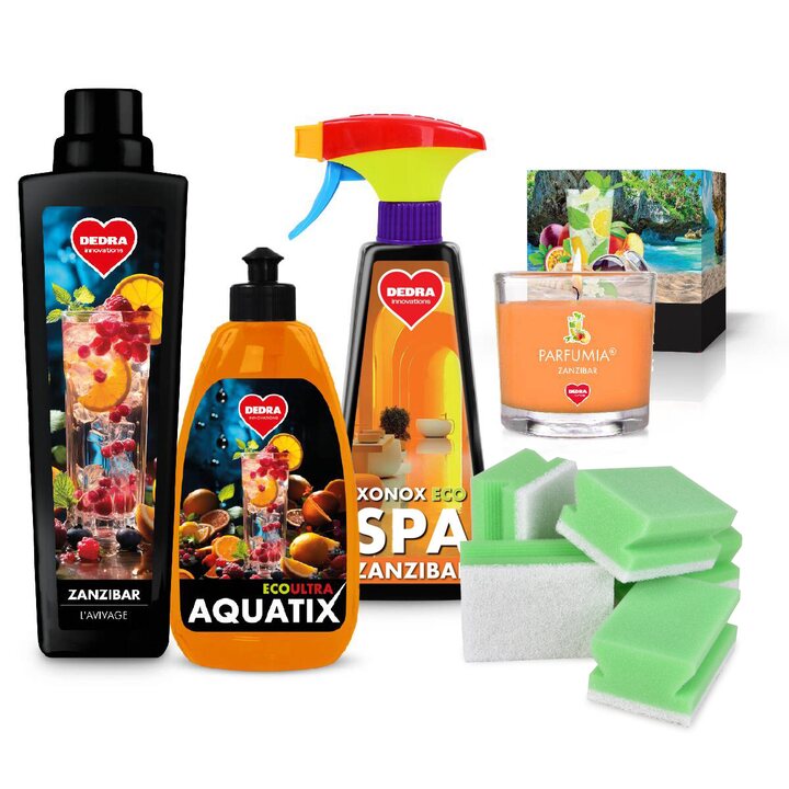 Dárková sada DEDRA ZANZIBAR je ideální volbou pro milovníky čistoty a exotických vůní. Obsahuje avivážní kondicionér, čistič koupelen, prostředek na mytí nádobí, sójovou svíčku a XL houbičky. Vonný set inspirovaný Zanzibarem dodá svěžest a relax celé domácnosti.