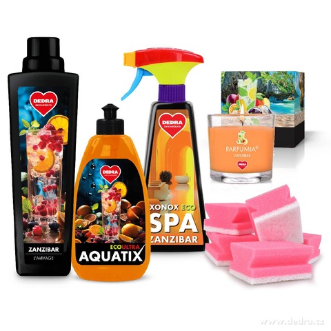 Dárková sada DEDRA ZANZIBAR je ideální volbou pro milovníky čistoty a exotických vůní. Obsahuje avivážní kondicionér, čistič koupelen, prostředek na mytí nádobí, sójovou svíčku a XL houbičky. Vonný set inspirovaný Zanzibarem dodá svěžest a relax celé domácnosti.