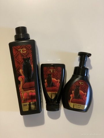 Sada RED VELVET obsahuje: avivážní kondicionér 750 ml, parfém na praní a úklid PARFUMAGE® RED VELVET, 750 ml, pěnové mýdlo na ruce i tělo 300 ml