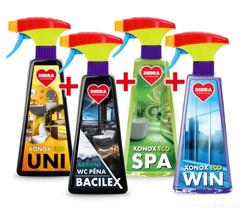 Kompletní sada pěnových čističů: XONOX ECO UNI, BACILEX (WC pěna), XONOX ECO SPA (vodoodpudivý efekt) + ZDARMA XONOX ECO WIN (čistič oken a zrcadel). Vysoce koncentrované, šetrné k prostředí, vyrobené v ČR – pro dokonale čistý domov bez kompromisů.