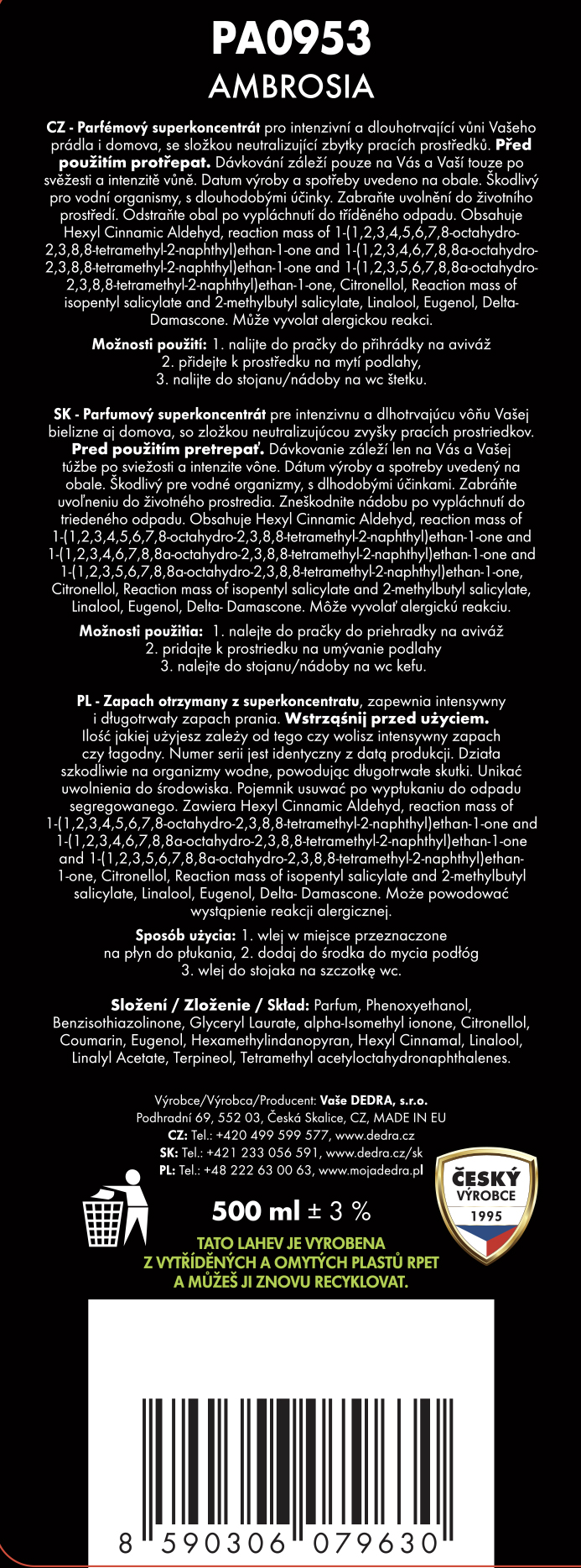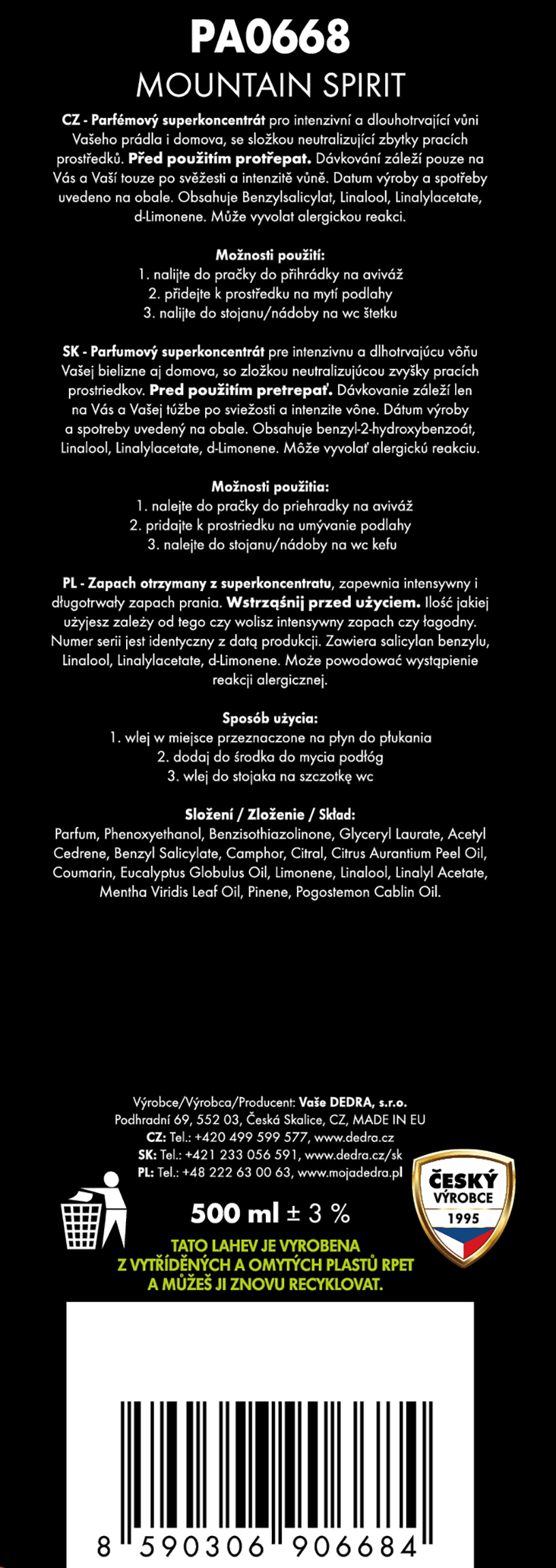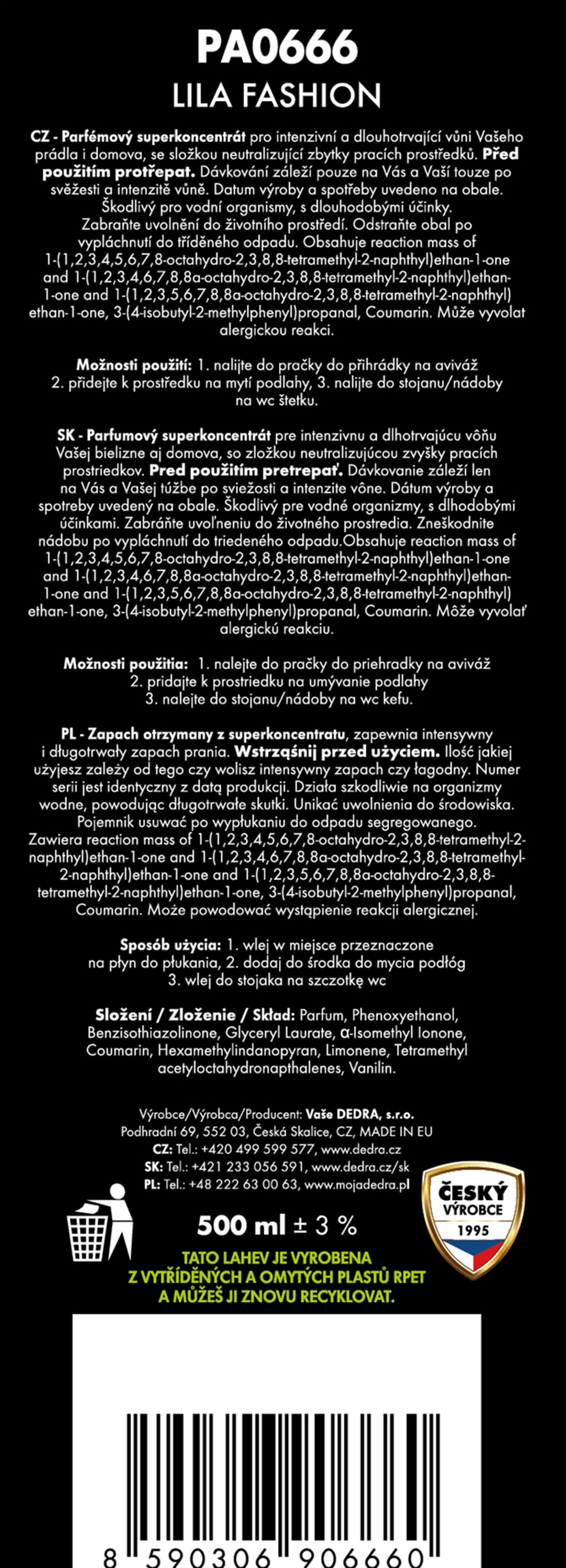 Výrobce / dovozce: Vaše Dedra s. r. o., Podhradní 69, Česká Skalice, Česká republika