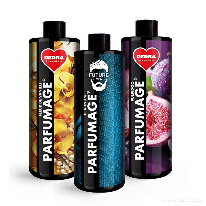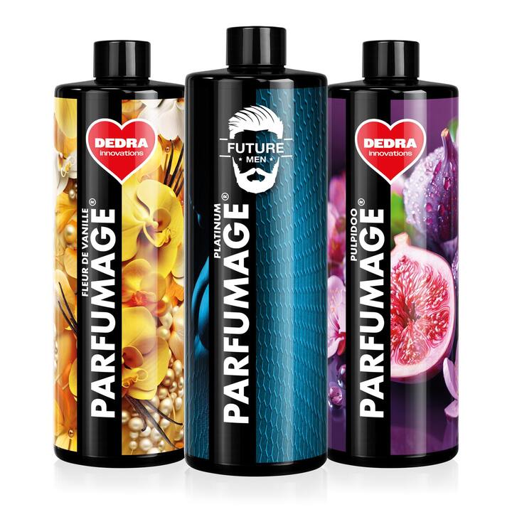Rodinné balení PARFUMAGE – parfémy na praní a úklid FLEUR DE VANILLE, PLATINUM a PULPIDOO. Tři oblíbené vůně pro svěží prádlo i domácnost. Praktická volba pro každodenní praní a úklid s dlouhotrvajícím vonným efektem.