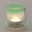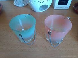 SKLENĚNÝ SVÍCEN na čajové svíčky ve tvaru kyblíku z barevného skla s kovovým držadlem. Přechod barev dodá svícnu na originalitě. Rozměr: průměr spodní část 5,7 cm, průměr horní část 7,6 cm, v 7,8 cm.