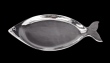 Keramický tác ve tvaru ryby ve stříbrné barvě.