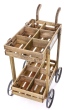 Dřevěný vozík se 4 kovovými funkčními kolečky, 2 police – každá rozdělená na 6 přihrádek (17,5 x 15,5 cm).