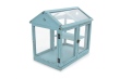 Dřevěný skleník ve tvaru domku s dvojitými dvířky, uzavírání na kovový háček, skleněná výplň, uvnitř polička.