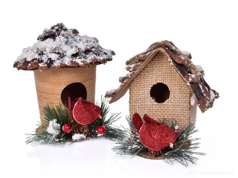 Závěsná dekorativní ptačí budka s přírodními prvky a červenou ptáčicí vnese do interiéru nádech zimní pohádky. Ideální jako vánoční ozdoba na stromek nebo zimní aranžmá ve venkovském stylu.