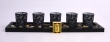 5 ks skleněných svícnů na dřevěném podstavci s dekorativními kameny,