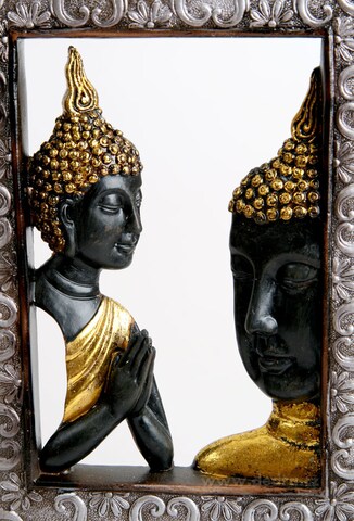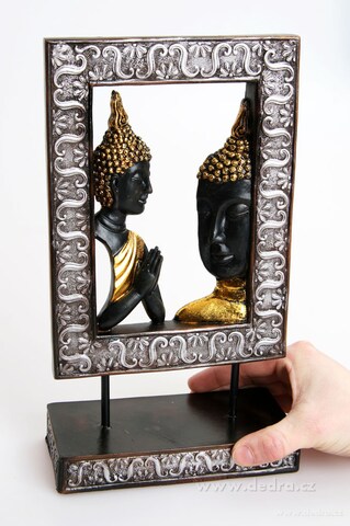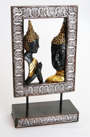 Prostorová plastika s motivem Buddhy. Materiál: přirodní pryskyřice. Šířka: 17 cm, výška 31 cm.