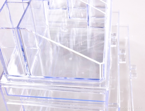 Tři prostorné zásuvky ochrání tvou kosmetiku i doplňky, zatímco horní část nabízí 16 přihrádek, kde přehledně uspořádáš rtěnky, laky na nehty, tužky nebo drobnosti. Vyroben z tvrzeného čirého plastu, který je odolný, elegantní a snadno se čistí. Hodí se do koupelny, ložnice i na toaletní stolek – a promění každodenní rutinu v radost.