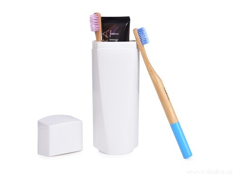 Cestovní pouzdro na zubní kartáčky a pastu, vyrobeno z pevného plastu.