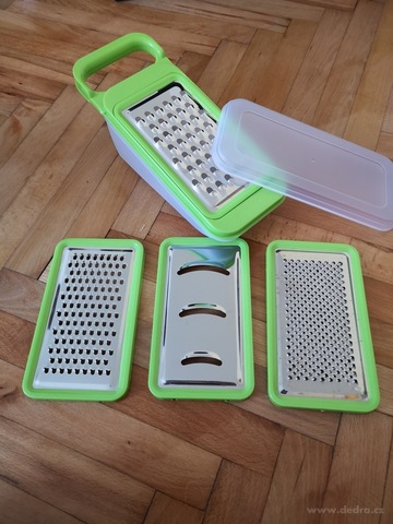 Multifunkční struhadlo 4v1 se zásobníkem (800 ml) pro čisté a pohodlné strouhání. Obsahuje 4 výměnné nástavce, víko pro uchování potravin i ochranu čepelí a ergonomické držadlo. Nerezová ocel a odolný plast.