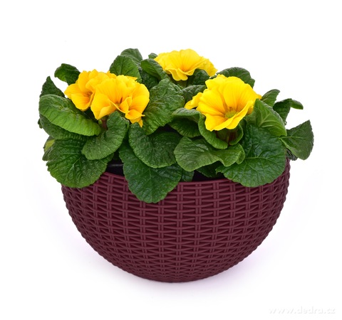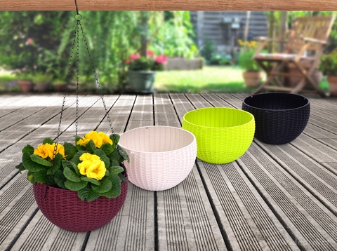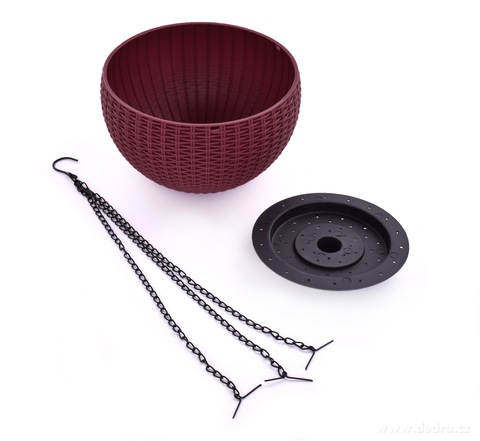 ZÁVĚSNÝ SAMOZAVLAŽOVACÍ KVĚTINÁČ imitace ratanu, součástí je vyjímatelné samozavlažovací dno a kovový řetízek na zavěšení, ve spodní části vypouštěcí uzávěr. Vyrobeno z odolného plastu. Průměr 22 cm, výška 13,5 cm.
