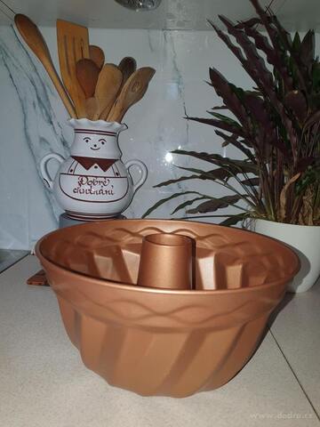 Velká forma na bábovku BIOPAN® GOLD 3400 ml s prémiovým nepřilnavým povrchem pro snadné vyklopení a rychlé čištění. Ideální na bábovky, dezerty i slané pokrmy. Odolná, bez PFAS, vhodná do všech typů trub.