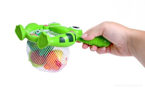 SÍŤ ŽABKA, set do vany se síťovaným košem ve tvaru žáby, čtyřmi různými zvířátky. Vyrobeno z odolného plastu.