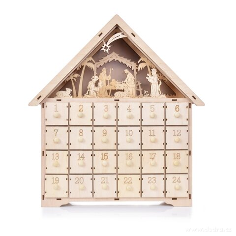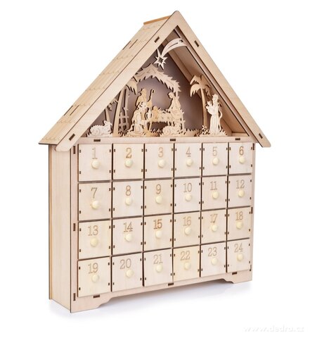 Luxusní dřevěný adventní kalendář ADVENTNÍ BETLÉM s LED osvětlením a betlémskou scénou nabízí 24 zásuvek na malé dárky. Výška 42 cm, tradice pro děti i dospělé, která vnese kouzlo Vánoc do každého domova.