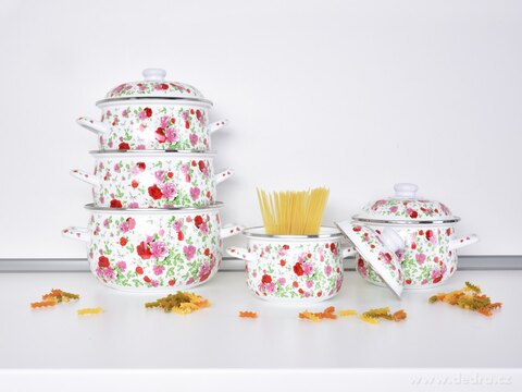 10 dílná sada smaltovaných hrnců s poklicemi. S květinovým motivem. Hrnce lze použít na všechny typy varných ploch včetně indukce. Vhodné do myčky nádobí.