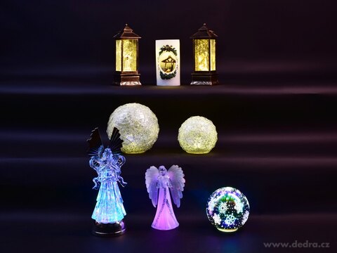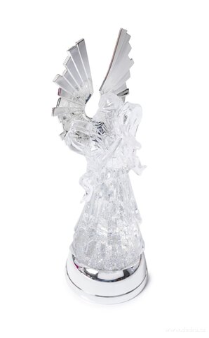 Velký LED svítící anděl z průhledného plastu se stříbrnými křídly, uvnitř barevné osvětlení s poletujícími třpytkami. Rozměry: průměr 12 cm, výška 35 cm.