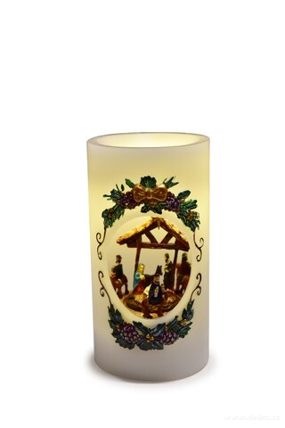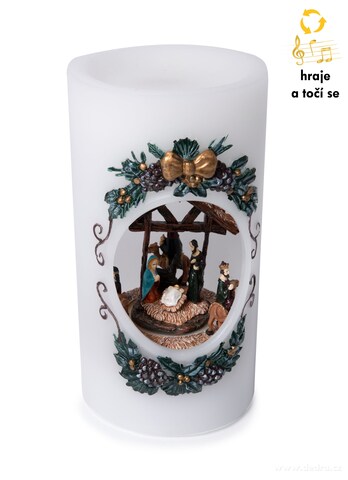 XXL svítící LED betlém uvnitř svíce z přírodního vosku. Betlém se uvnitř svíce točí a hraje melodii, kterou lze vypnout.