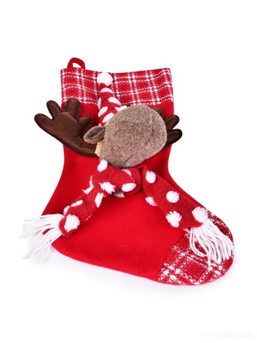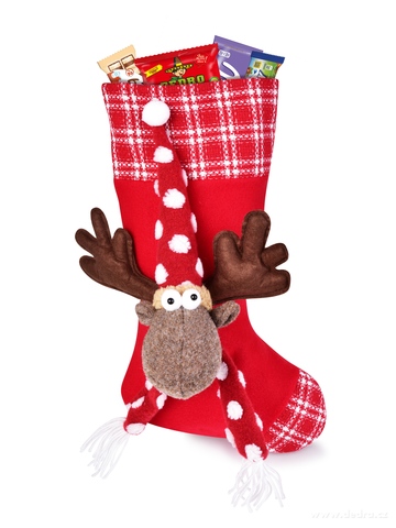 Velká textilní MAXIPUNČOCHA SE SOBÍKEM o výšce 46 cm z hebkého mikroplyše. Ideální na Mikulášskou nadílku i jako sváteční dekorace. S poutkem na zavěšení, veselým designem a dostatkem prostoru na sladkosti.