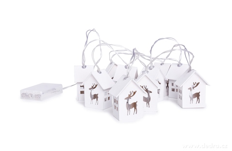 LED svítící řetěz s 10 vyřezávanými domečky v bíílé barvě.