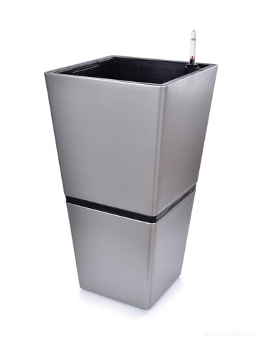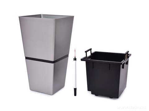 AQUARIUS LUXUSNÍ SAMOZAVLAŽOVACÍ DESIGNOVÝ XL KVĚTINÁČ, stojící květináče se zavlažovacím systémem a vyjímatelným kontejnerem s dvěma uchy pro snadné vyjmutí, ve spodní části 4 kolečka pro snadnou manipulaci a vypouštěcí ventil, z pevného silnostěnného plastu s platinovým metalickým lakem.
