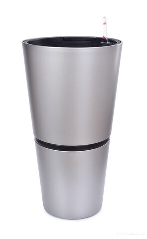 AQUARIUS LUXUSNÍ SAMOZAVLAŽOVACÍ DESIGNOVÝ XL KVĚTINÁČ, stojící květináče se zavlažovacím systémem a vyjímatelným kontejnerem s dvěma uchy pro snadné vyjmutí, ve spodní části 4 kolečka pro snadnou manipulaci a vypouštěcí ventil, z pevného silnostěnného plastu s platinovým metalickým lakem.