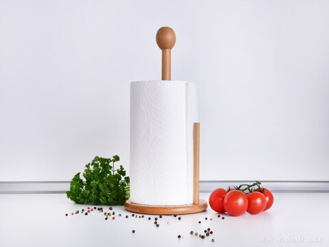 Ekologický bambusový stojan GoEco® (⌀16 × 34 cm) na papírové utěrky s praktickou zarážkou zabraňující nežádoucímu rozmotání. Vyroben z rychlerostoucího bambusu – antibakteriální, odolný a stylový doplněk každé kuchyně.