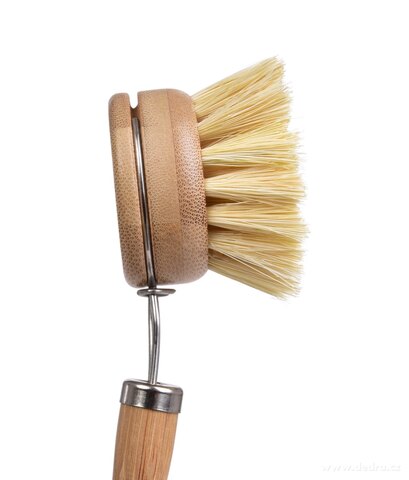 Bambusový kartáč s výměnnou hlavicí se štětinami ze sisalových vláken na nádobí i běžný úklid. Délka 22,5 cm, průměr hlavice cca 4,5 cm (štětin 5 cm), délka štětin cca 2 cm.