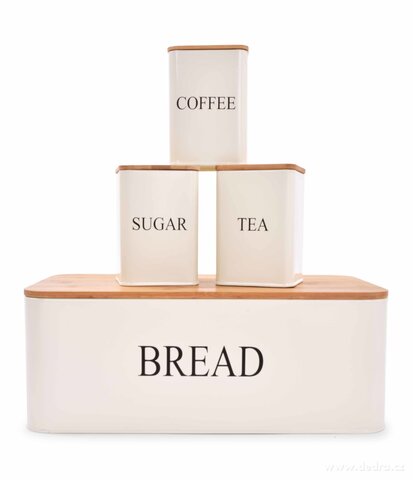 4 ks SADA chlebníku a kovových dóz TEA, COFFEE, SUGAR, víka dóz i chlebníku jsou z vysokotlakého bambusu.