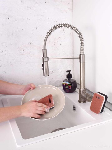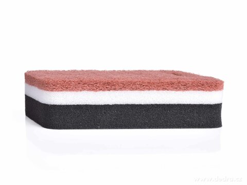 EXTRA ODOLNÁ! Dobře pění a nezpůsobuje škrábance, zdrsněná strana pro snadné odstranění zaschlých nečistot.