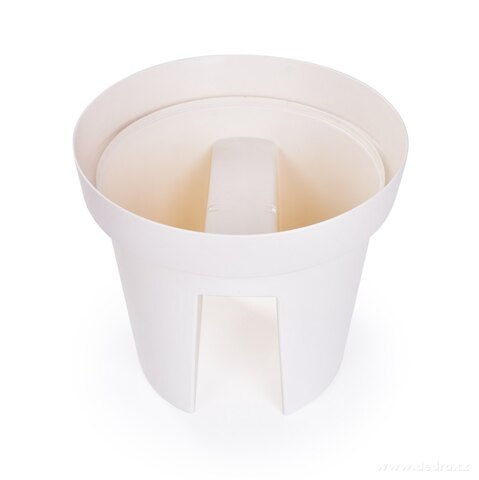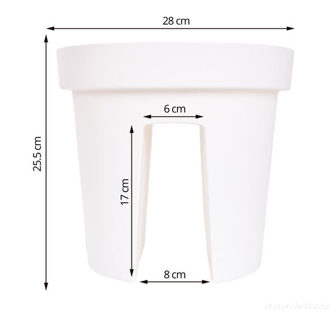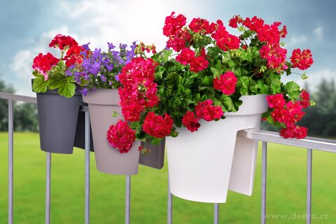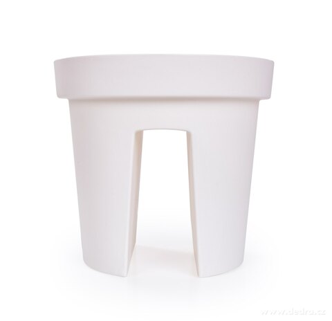 KVĚTINÁČ NA ZÁBRADLÍ s průřezem pro snadné usazení, vhodný pro zábradlí o max. šířce cca 6 cm (kulaté nebo ploché), vyrobeno z odolného plastu.