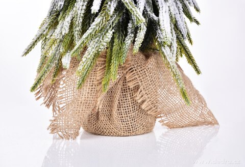 Zasněžený stromek JEDLE. Stojící dekorace s pevným podstavcem obaleném v jutové látce, průměr 22 cm, v 52 cm.