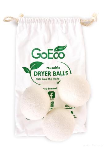 GoEco® SUŠIČKOKOULE – sada 3 ks z pravé ovčí vlny šetří čas i energii při sušení prádla (zkracují proces až o 20 %). Opakovaně použitelné místo jednorázových ubrousků, nezanechávají vlákna, lze je provonět parfémem na prádlo. V praktickém bavlněném sáčku.