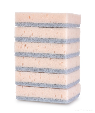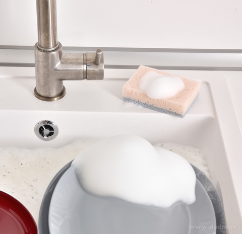 Dobře pění a nezpůsobuje škrábance, zdrsněná strana pro snadné odstranění zaschlých nečistot.