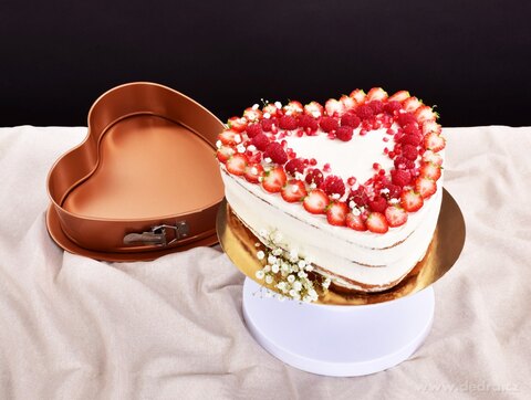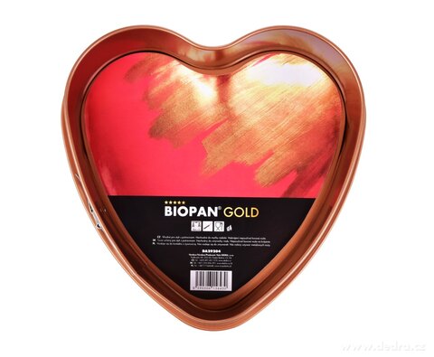 DORTOVÁ ROZKLÁDACÍ FORMA ve tvaru srdce, s kovovou přezkou pro snadné odepnutí obruče, dno s prolisem pro přenášení a servírování, z oceli se zlato měděným prémiovým nepřilnavým povrchem BIOPAN® GOLD, který se snadno udržuje a má dlouhou životnost.
