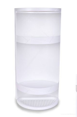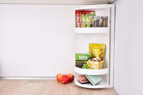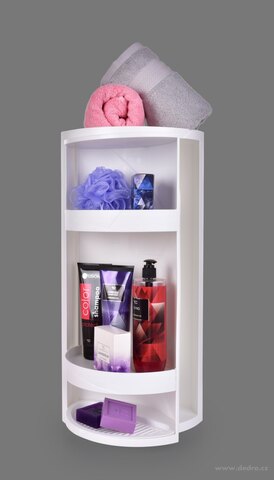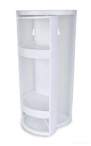 360° otočná rohová police/skříňka, vyrobena z odolného plastu. Součástí balení 2 přísavky, 2 silikonové samolepící podložky a lepidlo.