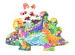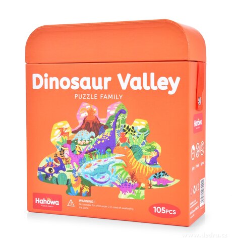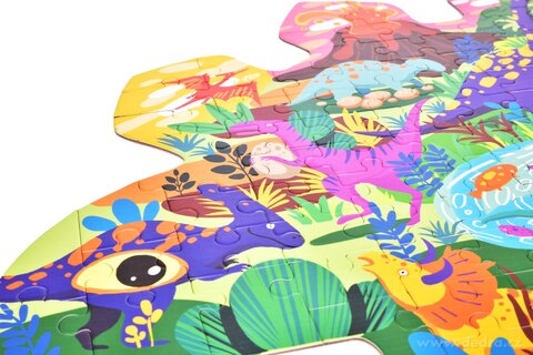 105 ks PUZZLE DINOSOUŘÍ SVĚT ve tvaru dinosaura, v praktickém kufříku s popruhem na přenášení, vyrobeno z pevného kartónu.