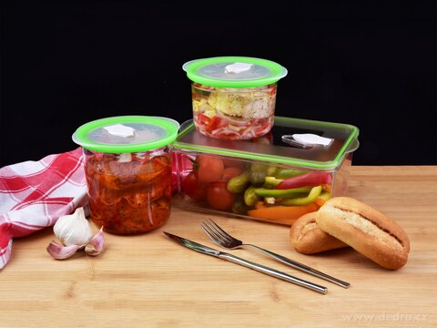 TRITANOVÉ DÓZY na potraviny s ventilem pro odsávání vzduchu pomocí automatické vakuovačky, víko se silikonovým těsněním. Silnostěnné provedení, materiál TRITAN (bez obsahu BPA). Kulatá, průměr 13 cm (šíře s ušima 14 cm)